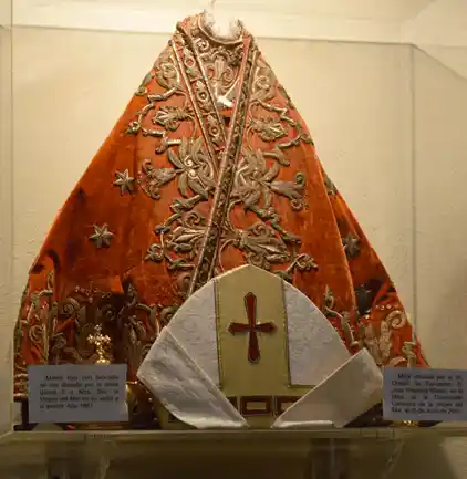 Reinando en Castilla el S.D. Felipe II y siendo Arzobispo de Bvrgos el Ilmo. D. Cristobal Bela el año de 1590 la tripulación de una fragata holandesa secta pirata de esta costa robó la milagrosa imagen de Ntra. Sra. del Mar que la devoción cristiana venera en el altar mayor de este Santvario habiendo repentinamente sobrevenido vna recia tempestad y tormenta y creyendo los piratas ser castigo merecido por su sacrilego robo la arrojaron al mar y a la vista de la villa de Castro reconocieron los vecinos flvctuaba sobre las agvas no lejos de dicha fragata la Sma. Virgen sirviendo de Bolisa dos hachas encendidas que a sus lados la alumbraban. A vista del portento salieron en un barco recogiéndola con la veneración posible la llevaron a la villa cvyos dos cabildos eclesiástico y secvlar la trajeron en solemne procesión hasta la de Laredo. Los de ella con igval solemnidad llegaron con ella a Santander y los de ella (Santander) con el mayor obseqvio, lvcido acompañamiento la colocaron en esta sv santa casa admirando este y otros continvos prodigios y milagros qve sv Sma. imagen ha obrado y obra la piedad de esta Soberana Señora.