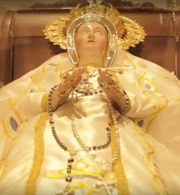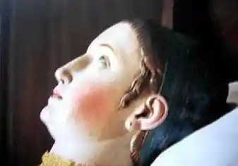 El rostro presenta la encarnación original, finamente aplicada. Presenta la boca ligeramente entreabierta, los ojos elevados en actitud anhelante, y el peinado a la romana, hacia atrás, con guedejas cayendo por delante de las orejas, que quedan totalmente a la vista. Cubre la cabeza con una toca corta labrada y policromada. Las manos están finamente labradas y los brazos están articulados permitiendo su movimiento, aunque al parecer la imagen está íntegramente labrada. El rostro indica claramente que es una obra vallisoletana de los años 30 del siglo XVII y encaja bien en el estilo final de Gregorio Fernández, aunque lo más probable es que se trate de la obra de alguno de sus contemporáneos.