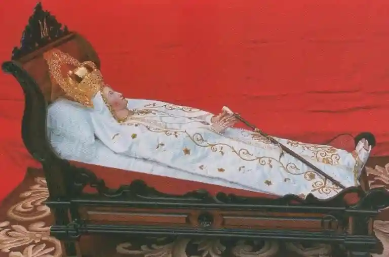 La corona fue regalo por suscripción popular con motivo del primer centenario de la fiesta de La Virgen de la Cama (1955). Según Carlos Xavier de Baranda '29' "la imagen fue encargada a un escultor de Valladolid, donde la superiora Sor Juana había tomado el hábito y donde residían sus padres don Luis de Morillas y doña Margarita Flórez, personas nobles, pudientes y bien relacionadas, quienes interpusieron todo su valimiento para conseguir una verdadera joya artística.