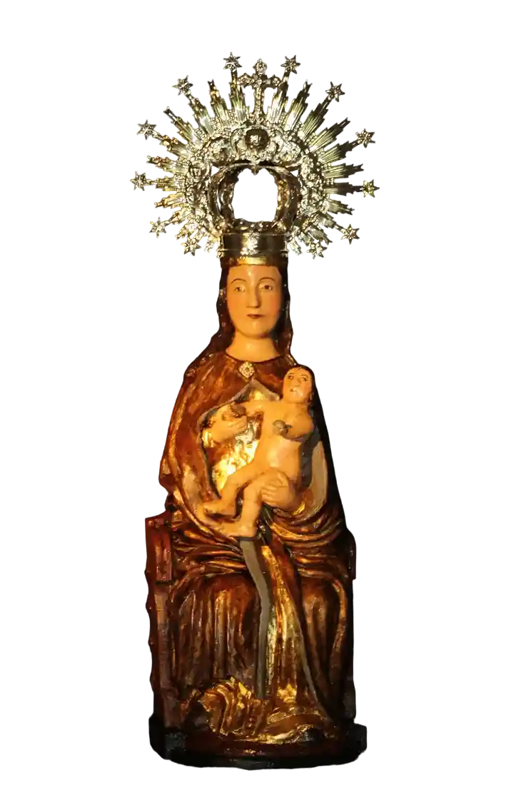 Es una talla de madera policromada, de estilo gótico popular sedente, con el Niño desnudo que mueve el brazo izquierdo. perteneciente al siglo XV, aunque algunos la sitúan en siglos precedentes. En su mano derecha sostenía un cetro, no conservado, y en su mano izquierda sostiene al Niño, que a su vez portaba, en sus orígenes un globo. Sobre el origen de la misma existe la leyenda popular de que en la segunda mitad del siglo XV, en un atardecer, unos pastores de la zona, en el monte Bizute encontraron, en el ahuecado del tronco de un roble que ardía, una sencilla y pequeña imagen. La llamaron "La Quemada", por tener en su dorso restos de aquel fuego.