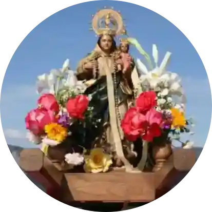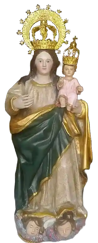 La imagen es una talla de moderna factura que presenta a la Virgen en pie sobre ángeles, llevando al Niño Jesús sobre su brazo derecho.