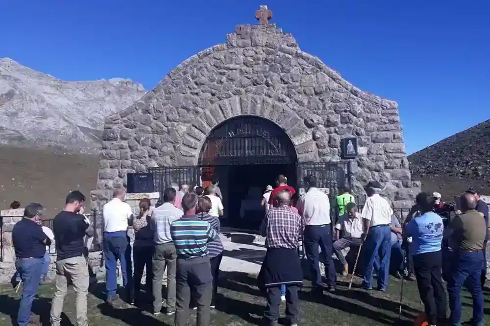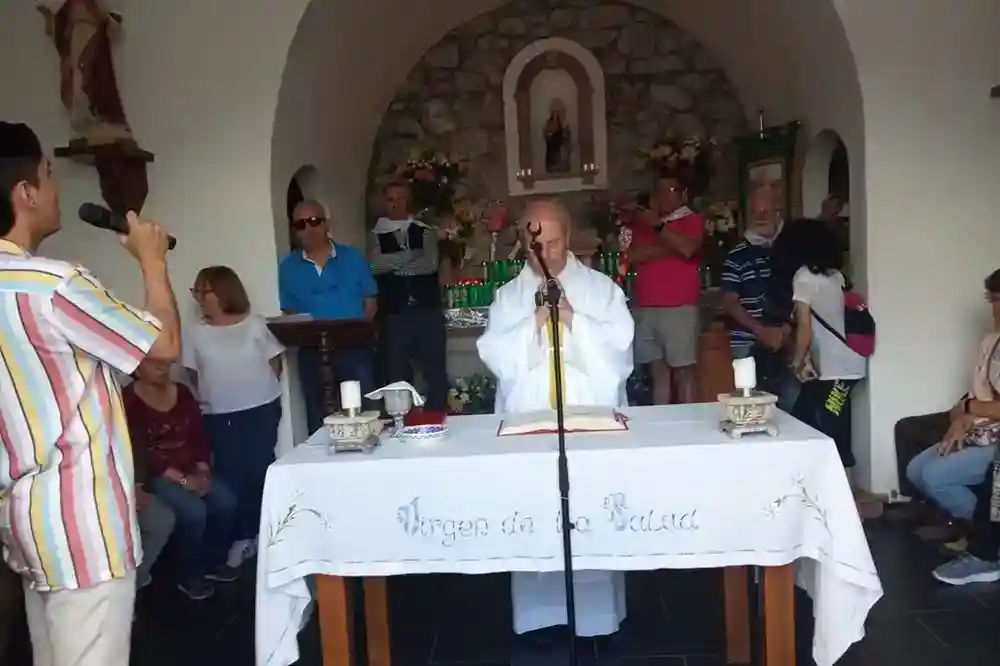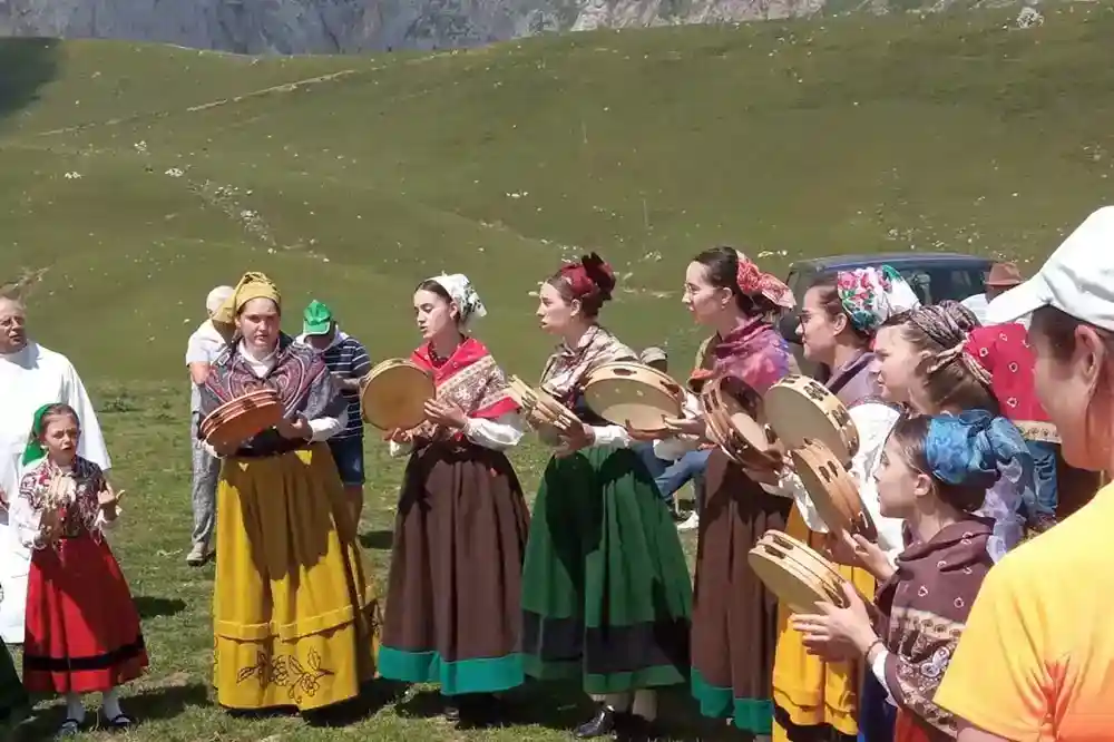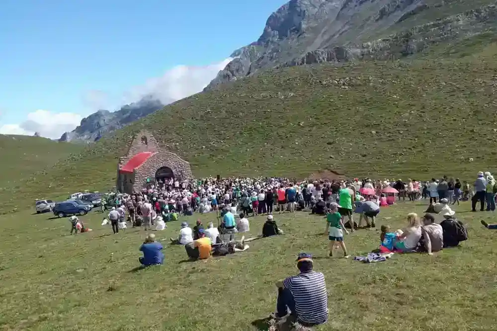 El día festivo en sí, comenzaba a las siete de la mañana (téngase presente que el horario entonces coincidía con el solar, no como ahora) cuando estaban ya instalados junto a la ermita los vendedores de dulces y refrescos. Los miles de peregrinos lebaniegos, asturianos y emigrantes de Camaleño repartidos por el mundo acuden a pie, a caballo o en coche todo terreno a lo más alto de los Picos de Europa a cumplir la tradición de venerar a la Virgen de la Salud. Muchos de ellos llegan luciendo «vistosísimos trajes». Después, unos años a las diez y otros a las once, se celebra la misa. La intención de la misma es por la salud espiritual del valle y su prosperidad material. El celebrante, en principio, debía ser el párroco de Pembes, «encargado de aquel santuario», a la sazón don Olegario Fernández, aunque excepcionalmente podía ser otro, como sucedió en 1913 en que lo fue el párroco de Baró, D. Martín González Alles. Durante la Misa, el coro estaba constituido por los vecinos de Pembes, de quienes se nos dice en 1915 que en la primera parte estuvieron regular para terminar bastante bien entonados, y en 1916 que se vio «reforzado con algunos valiosos elementos de la [Parroquia] de Espinama». La Misa se seguía con gran recogimiento, si bien por la «estrechez del local», con alguna incomodidad. Tras la Misa, cuya duración podía llegar a la hora y diez minutos, la fiesta continua con la comida campestre. Formados los corros en Campomayor, se da buena cuenta del vino y los manjares que se han llevado para la ocasión, «sin más interrupción que el armonioso cántico de unos setenta burros que se contestaban alternativamente».