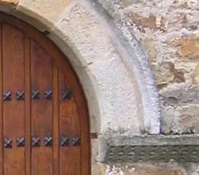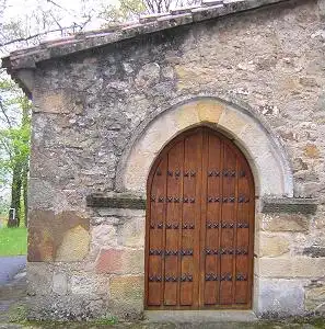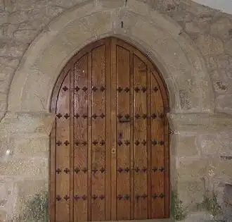 Las puertas tienen el arco apuntado, uno con clave y otro sin ella, trasdosado por un guardapolvos que apoya en cimacios de rombos. Una de ellas, la principal, se encontraría en el muro sur, y la otra en el hastial occidental de la primitiva fábrica, que tendría una sola nave.