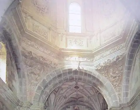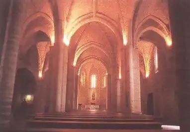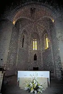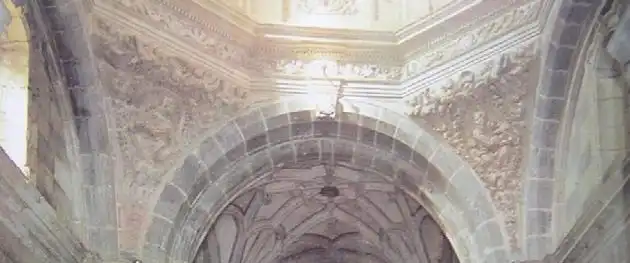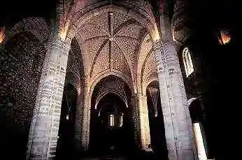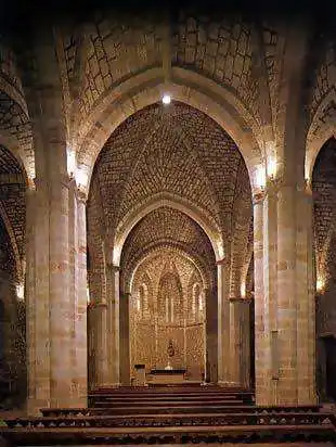 Así, el tramo central de la iglesia está cubierto con bóveda de crucería y las naves laterales son más estrechas, separándose del crucero por arcos de diagrama. La decoración es escasa y se concentra en los capiteles. Los nervios están apoyados sobre pilares de sección cuadrada con columnas entregas. En el hastial se encuentra una torre prismática en la que se coloca el coro.