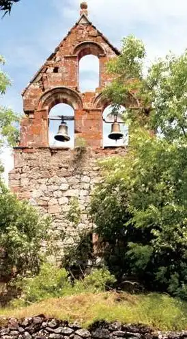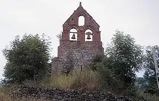 La espadaña es románica, con dos troneras bajas y una pequeña alta; las troneras bajas tienen dobles arcos de medio punto, capiteles, arquivoltas de baquetón y aún conservan alguno de los fustes. Los canecillos se conservan por todo el exterior de la iglesia.