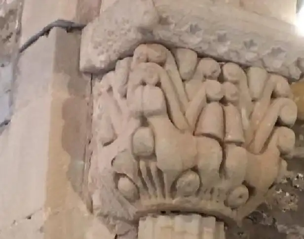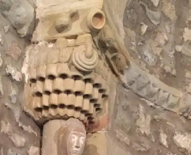 La separación de muros y bóvedas del presbiterio y ábside se hace por medio de una imposta decorada con cabezas de animales, bolas con caperuza, etc. La ventana central del ábside lleva arquivolta de escocia rellena de patos en diversas posturas.