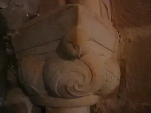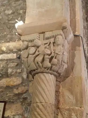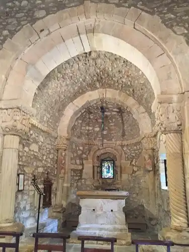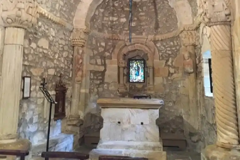 El ábside tiene arco de medio punto que da paso a al bóveda de horno, dicho arco, con dovelas apoya sobre capiteles que apoyan en originales fustes de tipo cariátide, uno de una Virgen sedente y el otro con la figura del apóstol.
