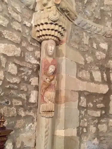 Las estatuas-columna del románico español pertenecen a distintos grupos escultóricos diferentes. Nos interesa destacar la presencia de estatuas-columna en el ámbito burgalés (Rebolledo de la Torre, San Pantaleón de Losa y Moradillo de Sedano), porque es de este núcleo burgalés de donde creemos que deriva el ejemplo de Escalante. Para el caso concreto de San Pantaleón de Losa, Pérez Carmona y Lojendio-Rodríguez relacionan este ejemplo con un grupo escultórico de fines del XII (consagra el templo Mauricio en 1207) activo en los valles burgaleses de Mena, Valdivielso y Losa. El grupo escultórico que abarca las iglesias del norte de Burgos y Cantabria ha sido estudiado por Paloma Rodríguez-Escudero, relacionando concretamente el ejemplo de Escalante con otras iglesias como Bareyo en Cantabria o Santa María de Siones en Burgos, donde aparece un capitel de "tegulae" del mismo tipo que el de la estatua-columna de la Virgen con el Niño en Escalante. Paloma Rodríguez-Escudero piensa que "los escultores o canteros (de Siones y Bareyo) serían los mismos. Este grupo también trabajaría en el Valle de Losa, pues tanto en San Pantaleón como en la iglesia de Colina de Losa los motivo s y la talla de la piedra mantienen puntos de contacto. Algo más lejos en San Román de Escalante, volvemos a encontrar en la escultura el eco de su trabajo. El grupo de canteros al que nos referimos pertenecería a la Trasmiera y norte de Burgos. Llegarían a los territorios hoy de Cantabria procedentes del Valle de Mena, ya que el románico cántabro es más tardío y sus estructuras evidencian mayor elaboración y una tendencia gótica más decidida". Para la misma autora, este grupo escultórico no tendría nada que ver con el románico palentino, y sería un grupo más aislado de las novedades.