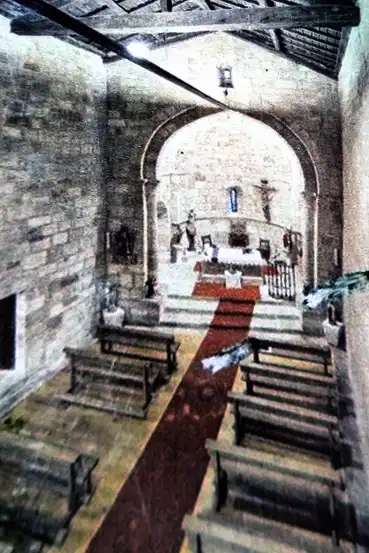 El presbiterio se cubre con bóveda de cañón apuntado y se abre la nave con un arco tonal también apuntado y doblado que se apoya sobre cimacios con decoración ajedrezada, que se repite en la imposta que rodea el ábside. Los capiteles llevan lazos cruzados y volutas, que podrían ser una representación del Purgatorio (el alma que se purifica antes de entrar en el Cielo).