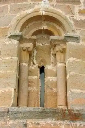 En el centro del paramento encontraremos un vano de medio punto trasdosado con arquivolta abocelada sobre capiteles de hojas verticales, que acaban en bolas con caperuza. Su rudimentario diseño evidencia una destreza escultora de evidente signo popular.