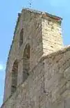 La espadaña se encuentra en el muro de los pies en el extremo contrario al ábside. Es románica se encuentra integrada en añadidos posteriores. Tiene dos arcos apuntados en un primer nivel más bajo y otro en el cimero.