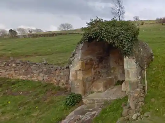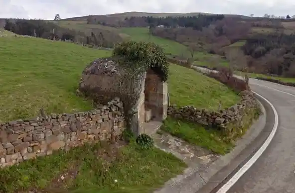 Humilladero con tejado abobedado vacío de imágenes, pero con tres cruces en el relieve de la pared del fondo; la cruz central mayor que las dos laterales.