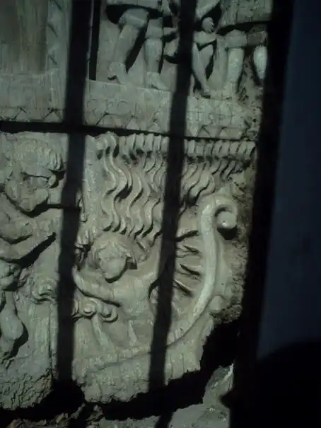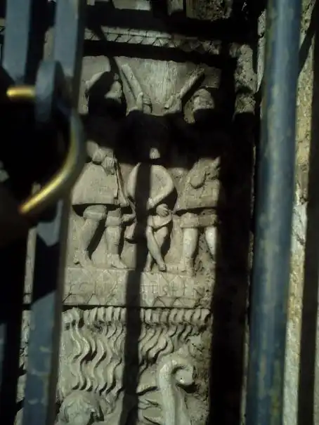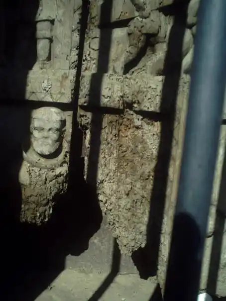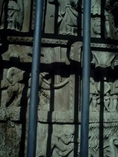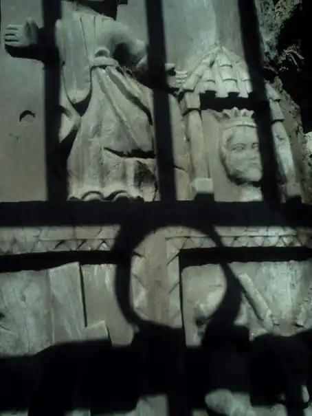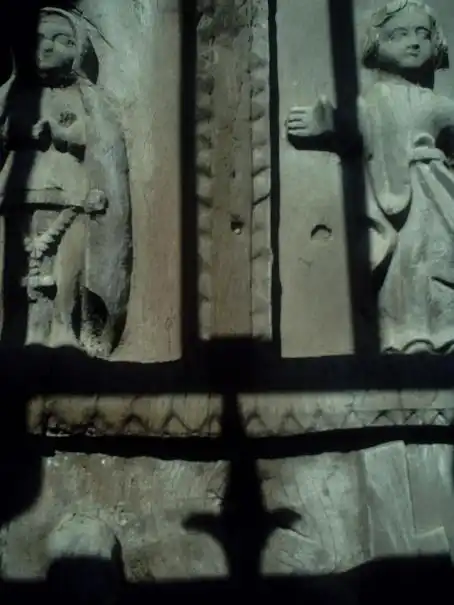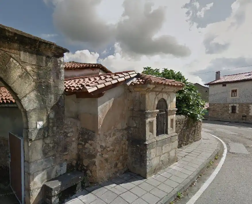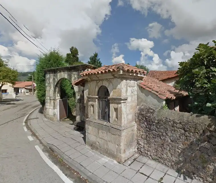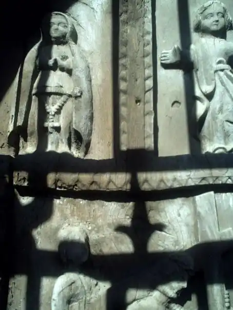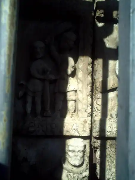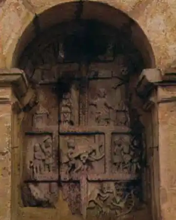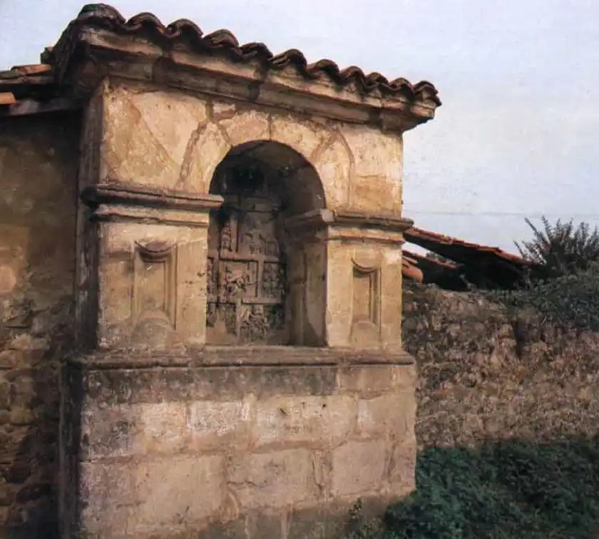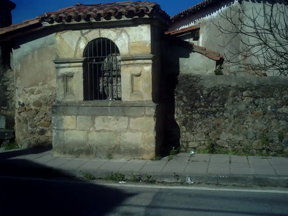 Humilladero incrustado en muro con interior con una madera tallada con escenas religiosas. Muy deteriorado.