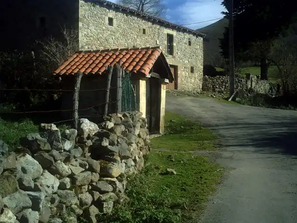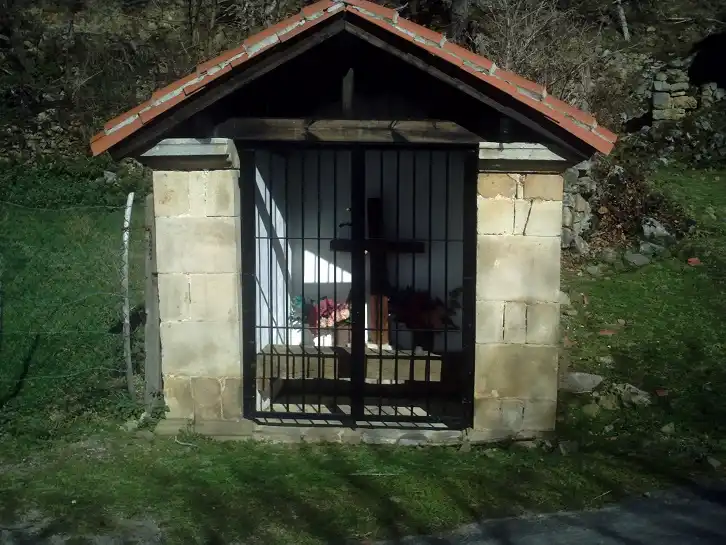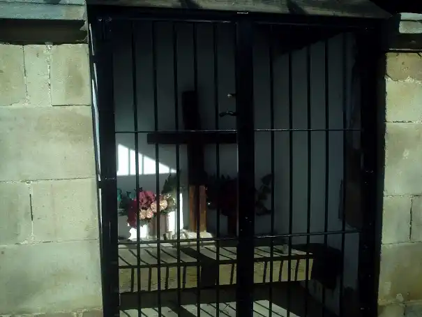 Humilladero a dos aguas con cruz de madera en su interior y cerrado con verja metálica.