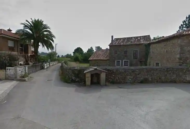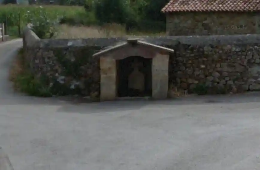 Humilladero a dos aguas con crucifijo en relieve en pared de fondo..
