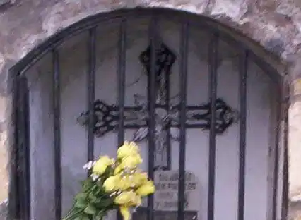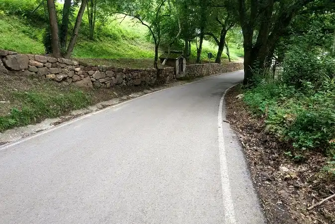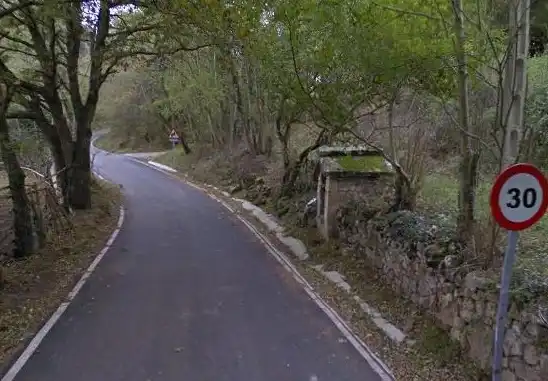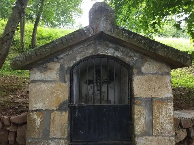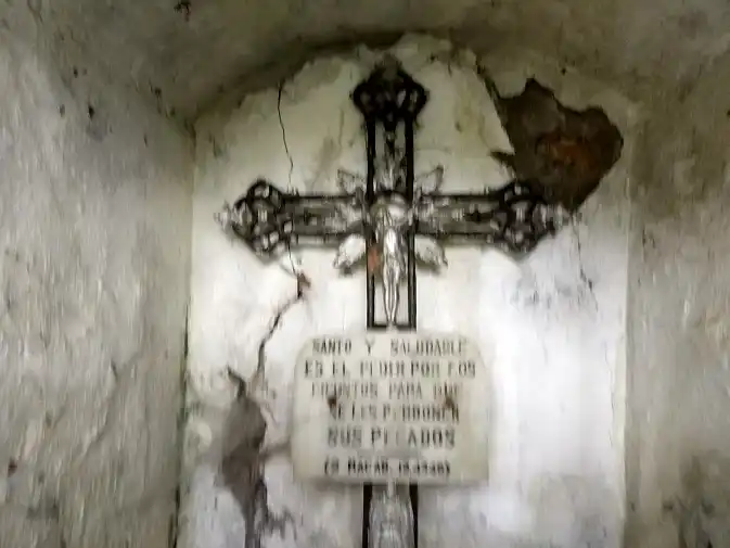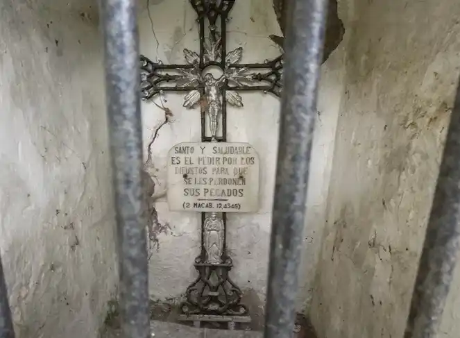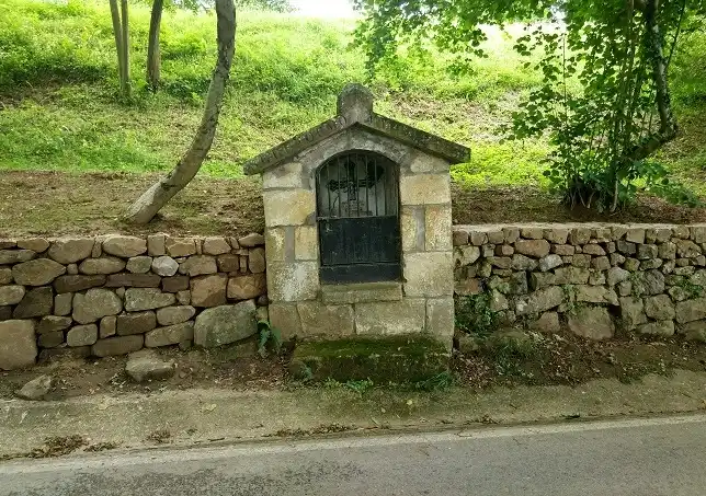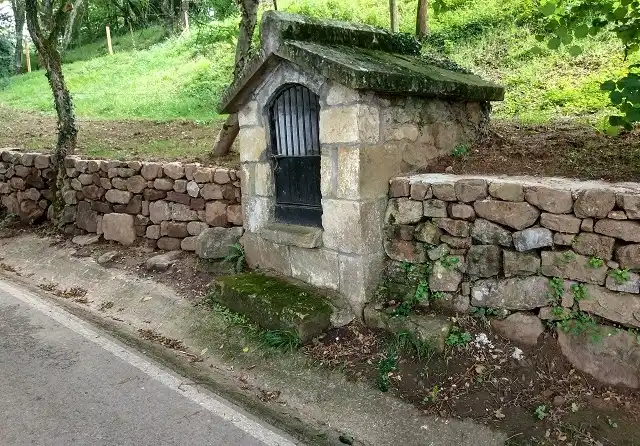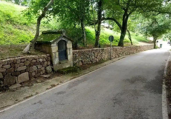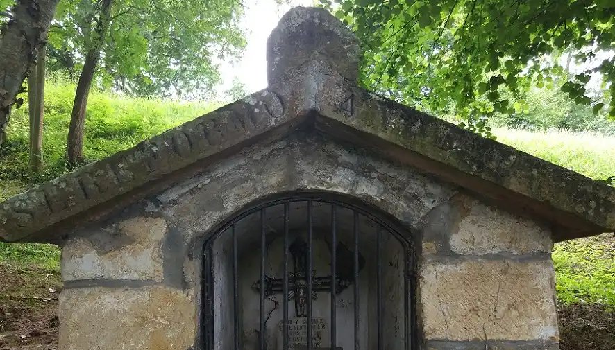 Humilladero. Fecha fotografias 9 de julio 2021. Pequeña construcción de planta cuadrada realizada en piedra de silleria con tejado también en piedra a dos aguas. Un hueco en el frente con arco de medio punto rebajado, al que se restringe el acceso por medio de una puerta metálica con reja en su parte superior. En su interior se encuentra un Cristo crucificado metálico con policromado en negro para la cruz y plata para la figura del Redentor. Por debajo una placa de mármol muestra el versículo: "Santo y saludable es rezar por los difuntos para que se les perdonen sus pecados (Macabeos, 12, 4346)". En el frente del alero se indica:"SE REFORMÓ" (izquierda) y "AÑO 1901" (derecha).