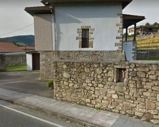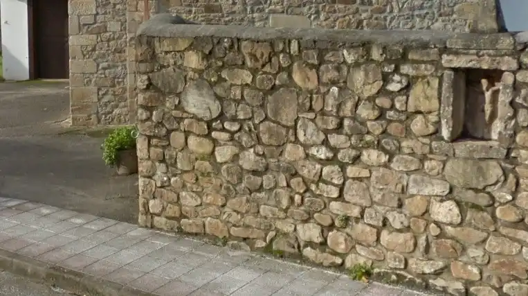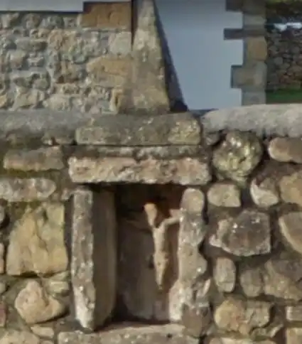 Hornacina cuadrada incrustada en muro con un cristo de piedra de labrado muy desgastado o tosco.