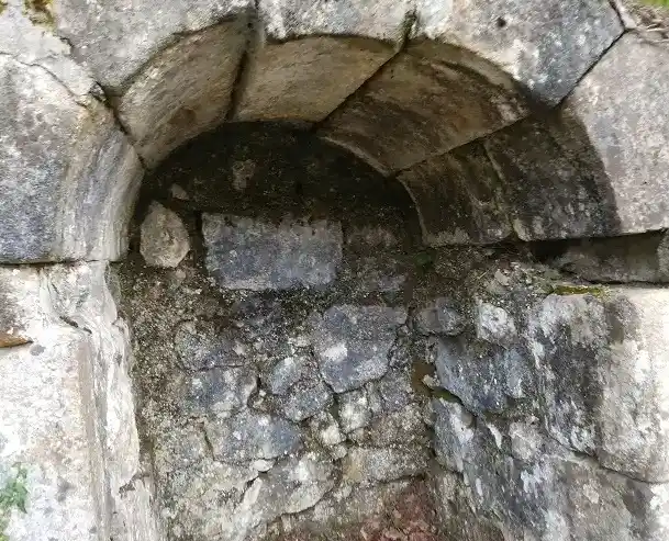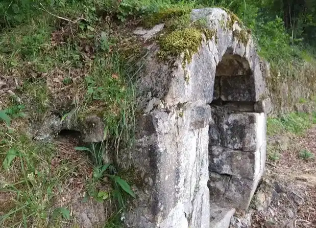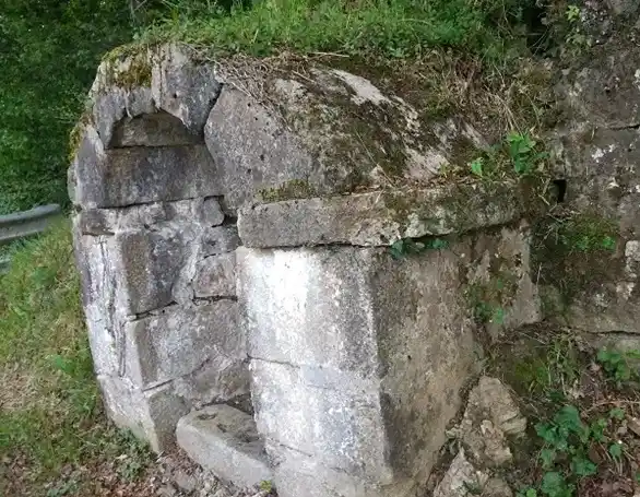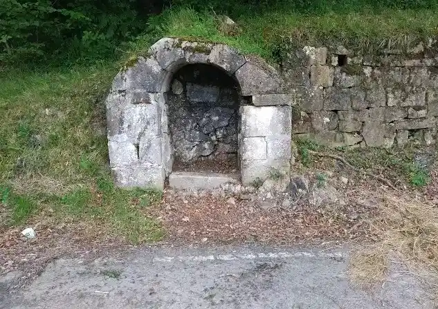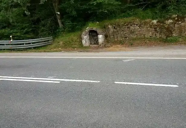 Humilladero abovedado en piedra, al lado de la carretera nacional de Santander-Burgos, al comienzo de la subida al puerto de El Escudo. Completamente vacío. Fotografiado en 5 de julio de 2021.