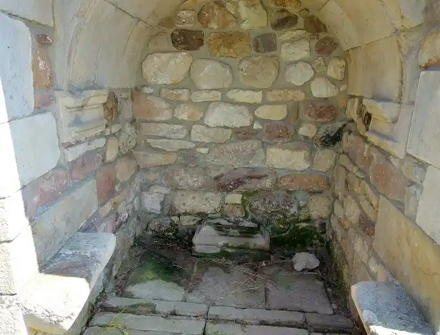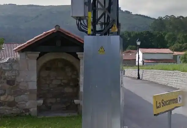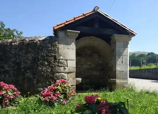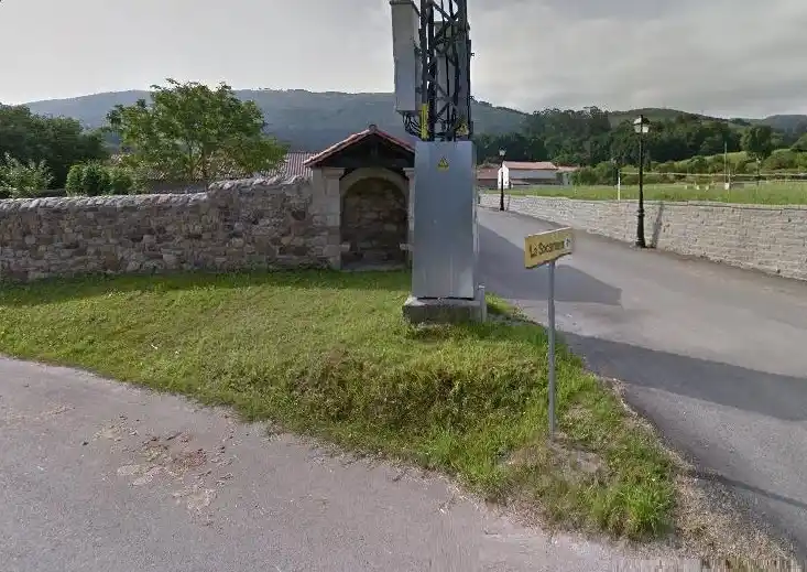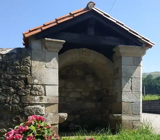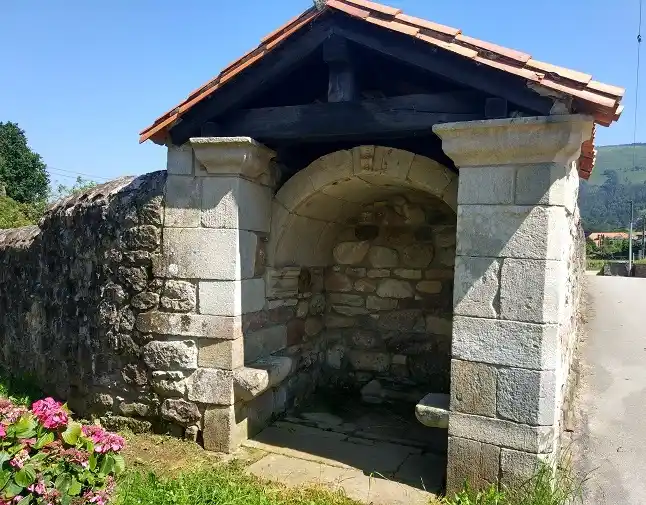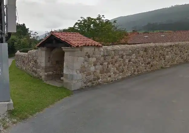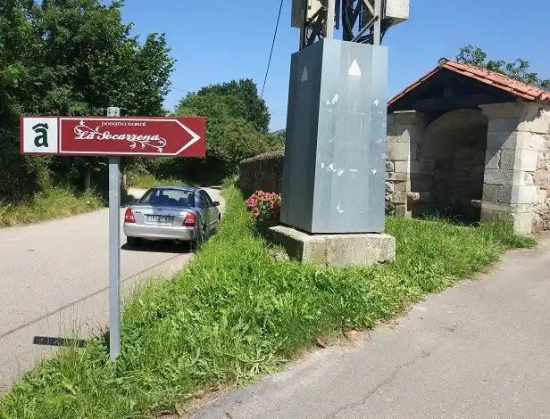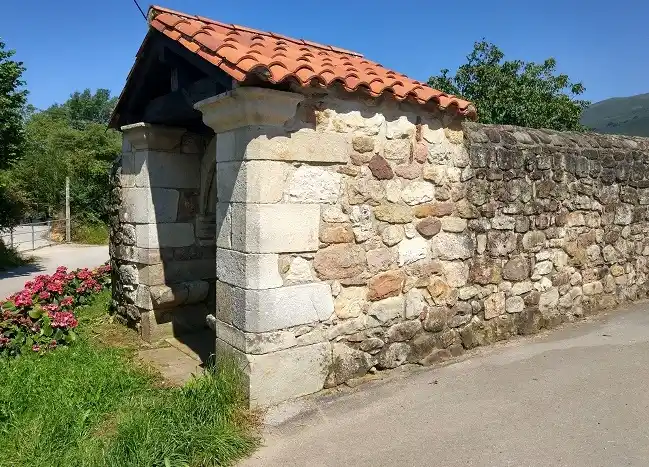 Humilladero retejado a dos aguas empotrado en esquina de muro de finca. Cuenta con asientos de piedra a ambos lados para reguardarse de la lluvia (asuviadero). Actualmente esta vacío, si bien se aprecia la base pétrea donde se hincaba la anterior cruz. Las fotografías del autor son de fecha 17 de julio de 2021.