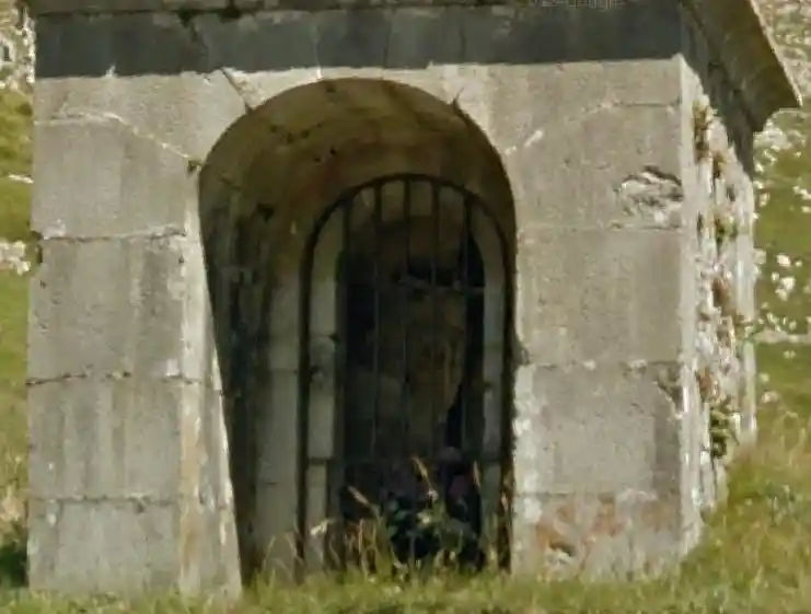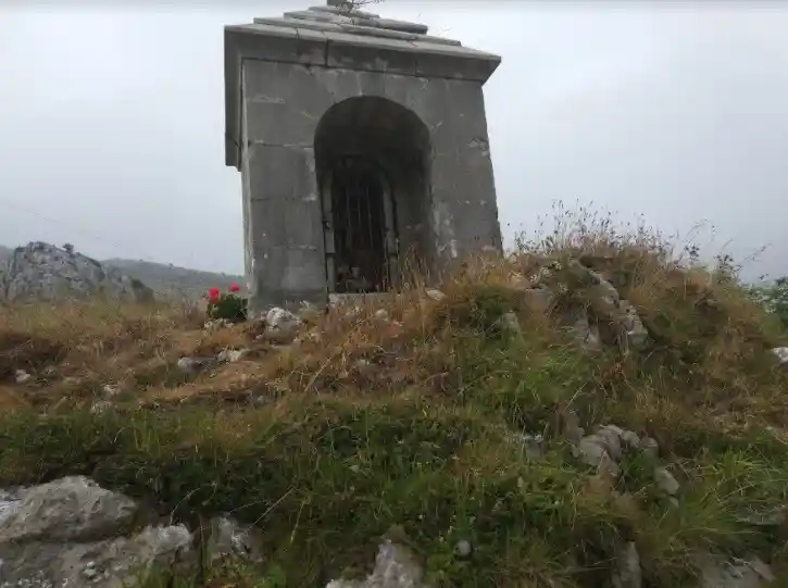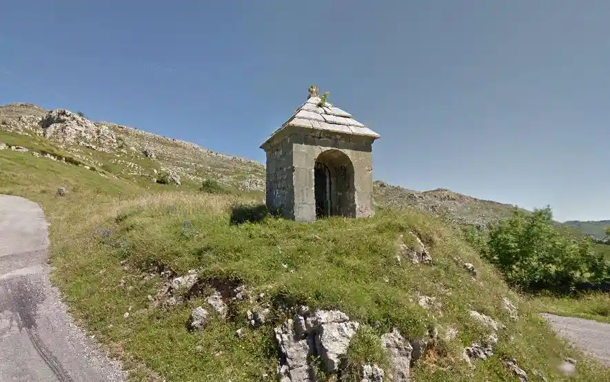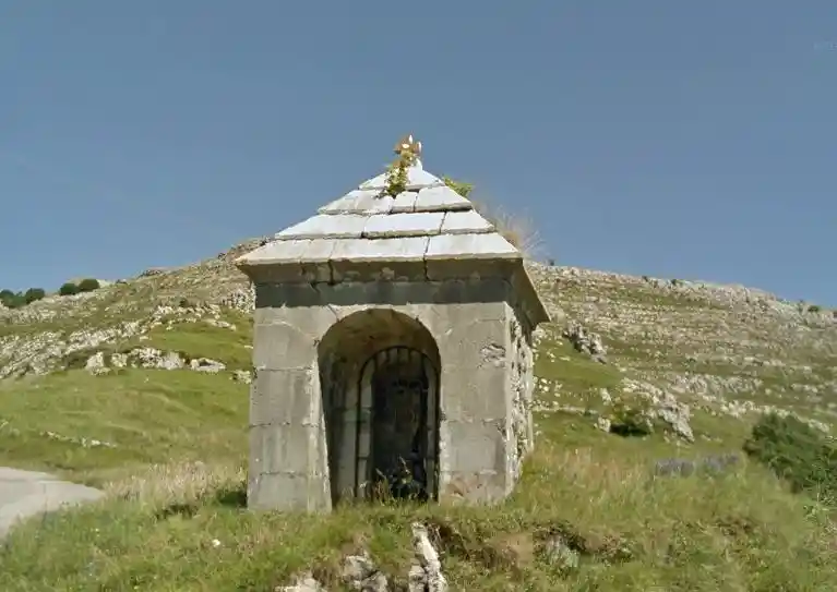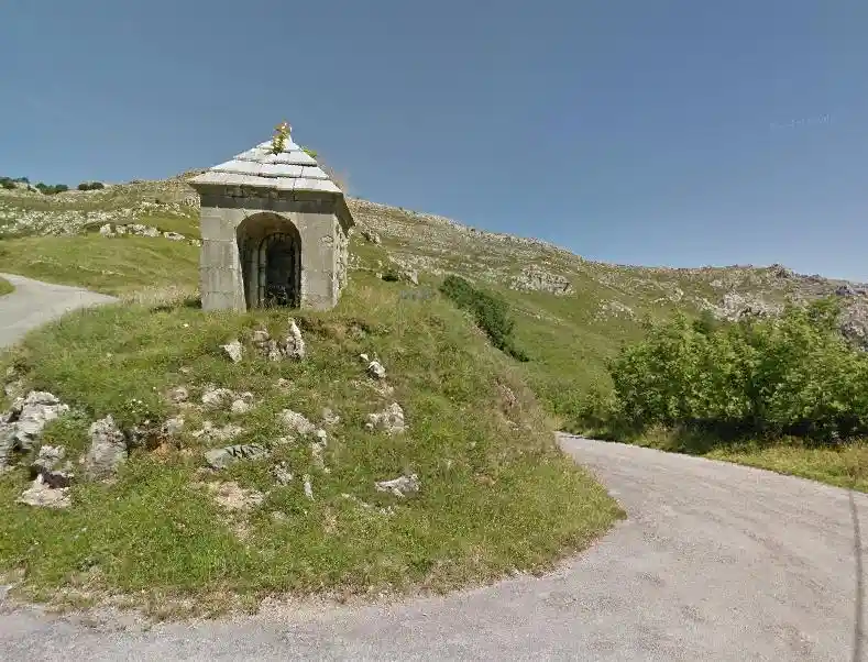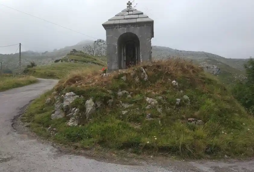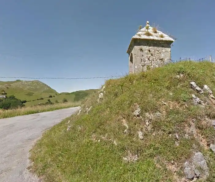 Humilladero de piedra. Sillares en las esquinas. Con una cruz en su cumbre, el tejado a cuatro aguas está cubierto con losas de piedra. Se abre en arco de medio punto.