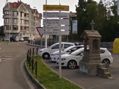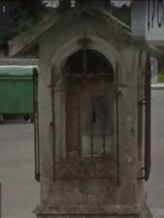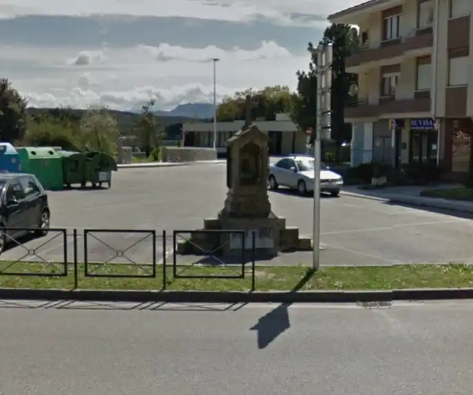 Humilladero de piedra en plaza central de Noja. En su interior enrejado, un busto de Cristo.