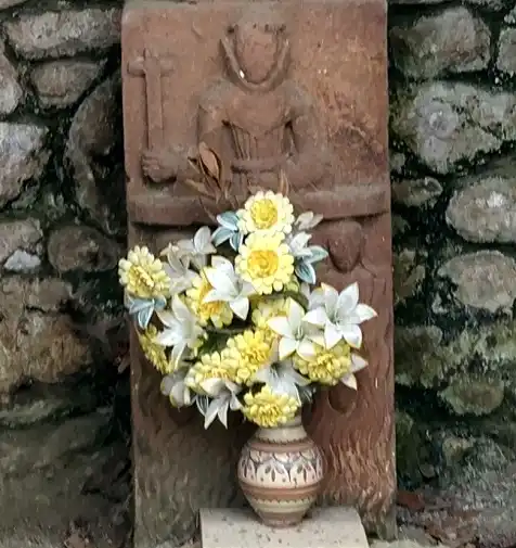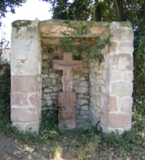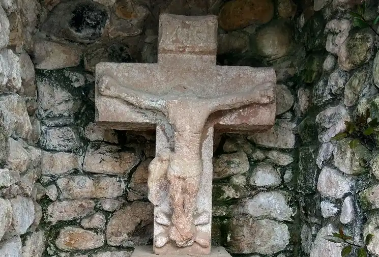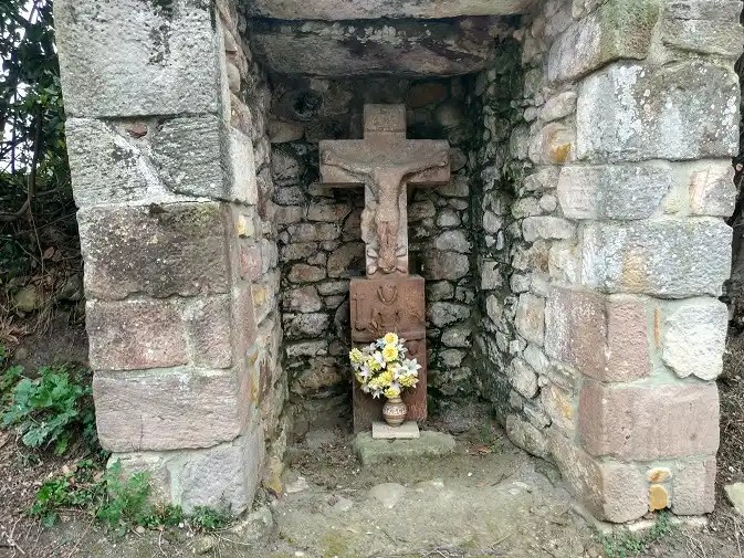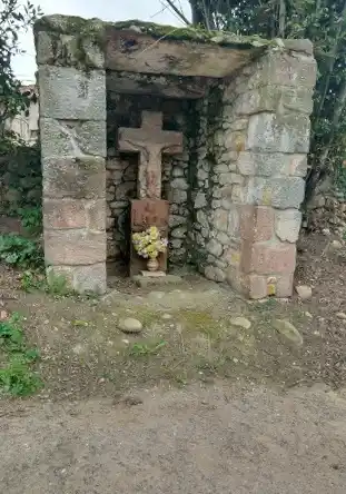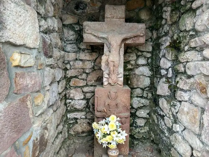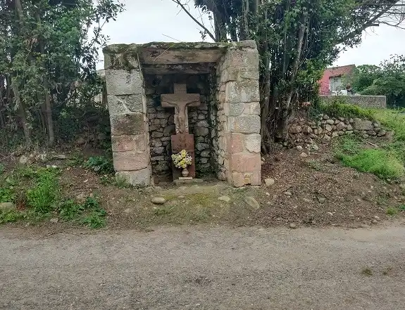 Humilladero de piedra con tejado a un agua con un cruz en su interior. Fotografías de 7 de mayo de 2021.