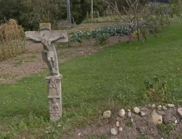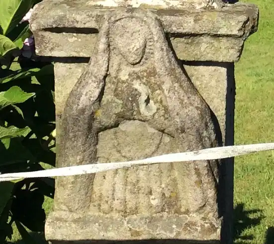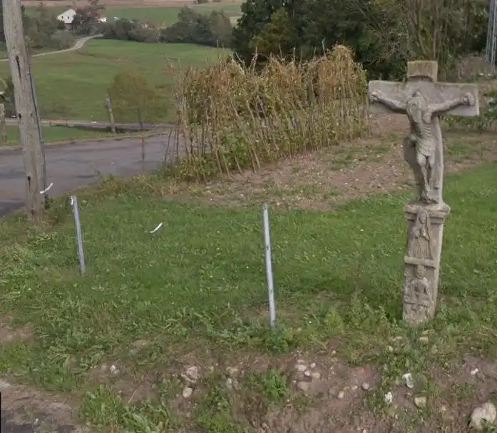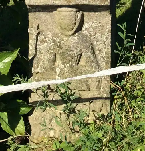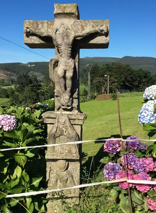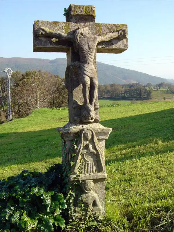 Cruz de ánimas labrada en piedra. En el pedestal donde se asienta la Cruz, con una imagen de Cristo a ella crucificado, las clásicas figuras de la Virgen y un Santo rescatando almas purgantes.