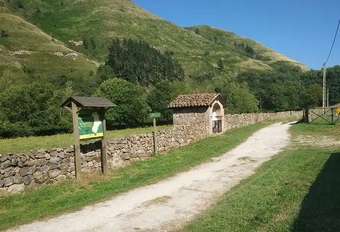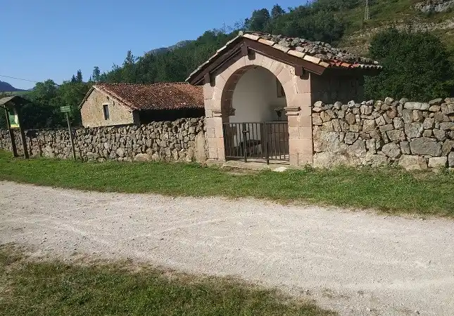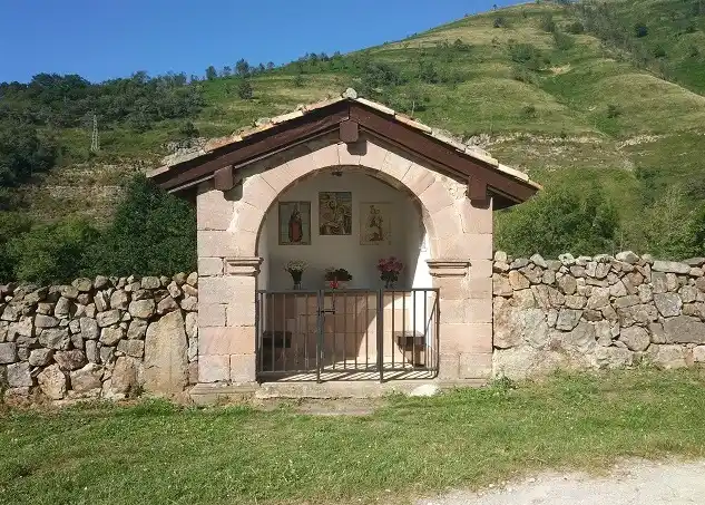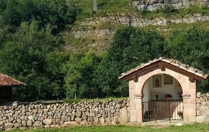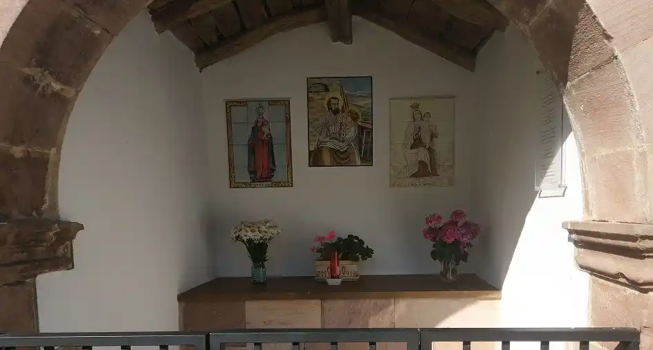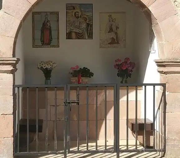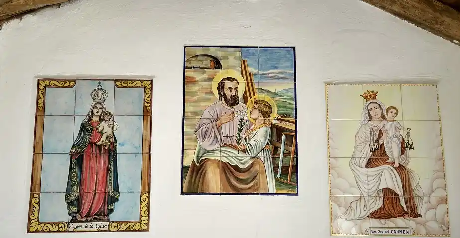 Humilladero. Fotografías tomadas el 18 de julio de 2021. Se trata de una edificación a dos aguas, cerrada con una verja pero que permite su apertura para cobijarse en su interior. Contiene tres murales hechos con baldosas dibujadas. Dos de ellos dedicados a la Virgen: uno a la Virgen de la Salud y otra a la del Carmen. El tercer mural presenta a San José trabajando con el Niño Jesús en la carpintería.
