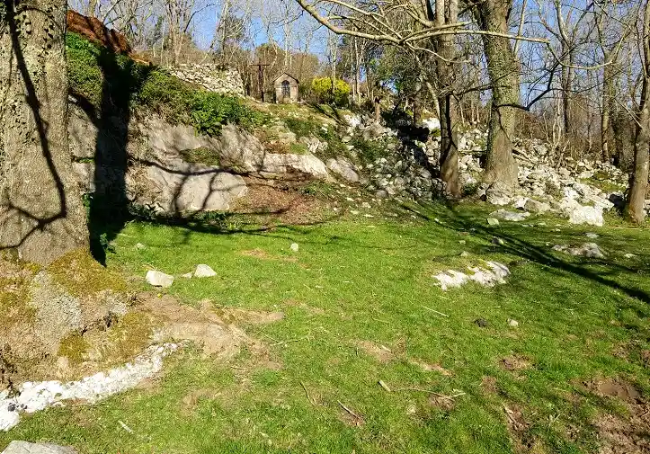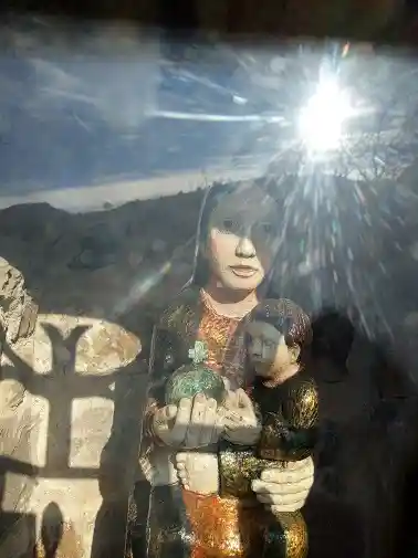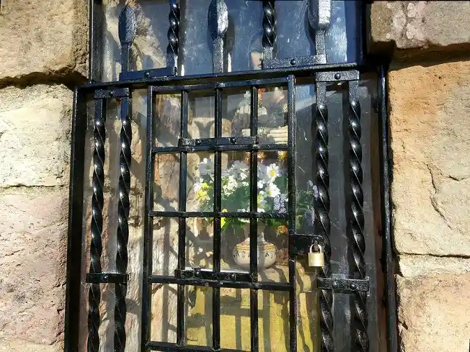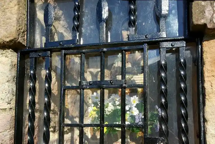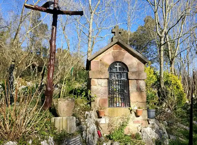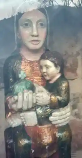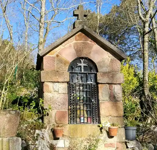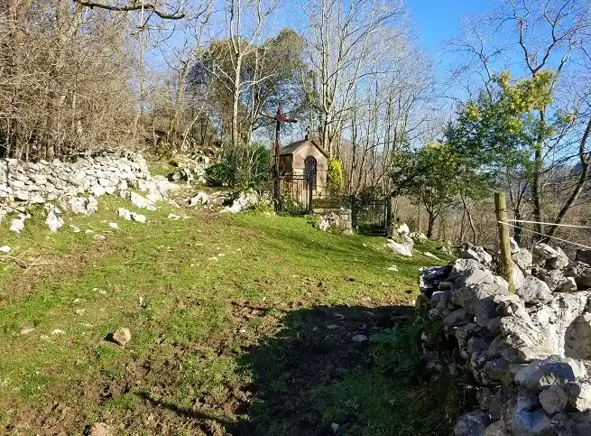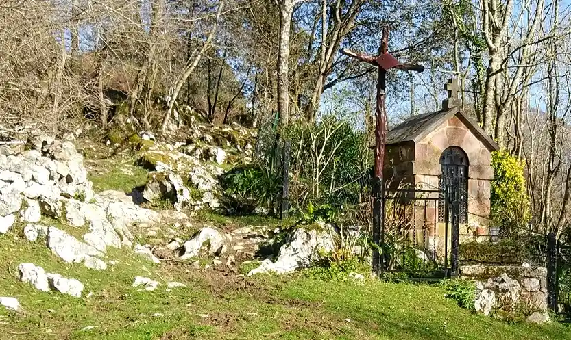 Humilladero en el Barrio de Trespeña, por encima del pueblo de Celucos, en un recóndito y montañoso lugar a unos 320 m de altitud. De cerca de allí parten rutas de subida a los picos de Ozalba. Fotografías de fecha 29 de enero de 2022. Contiene en su interior una imagen de la Virgen con un niño en su regazo y en la otra mano una esfera (¿símbolo de la Tierra?) con una cruz. La imagen tiene un cristal de protección y una reja metálica candada.