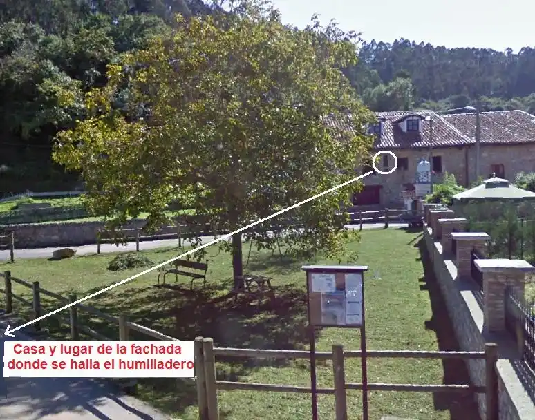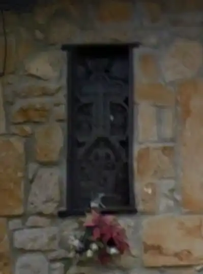 Cruz y ánimas purgantes en figura (aparentemente metálica) incrustada en edificio.