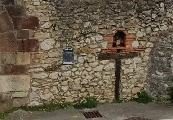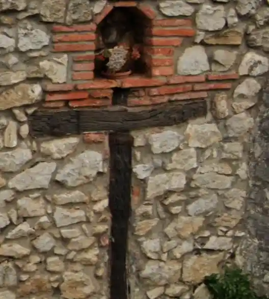 Cruz de madera incrustada en muro, con una hornacina superior de ladrillos para colocar flores