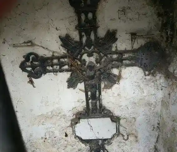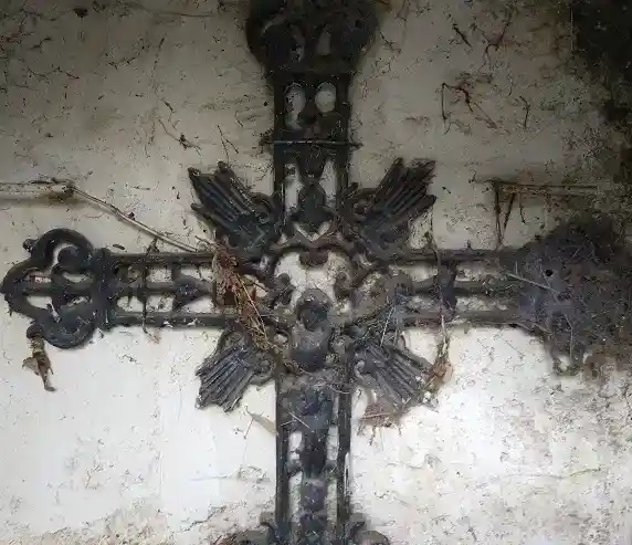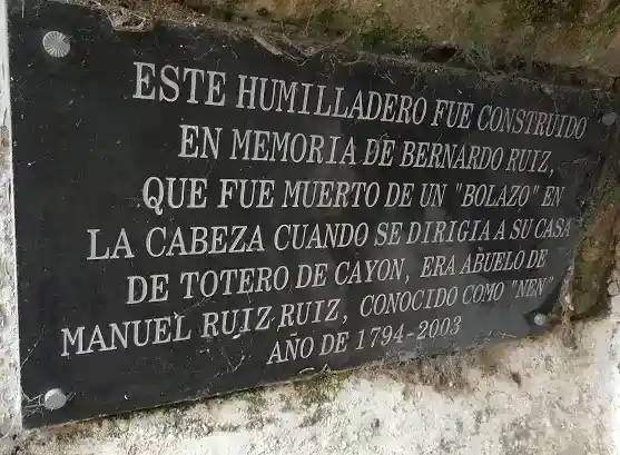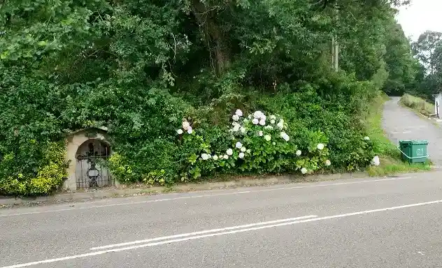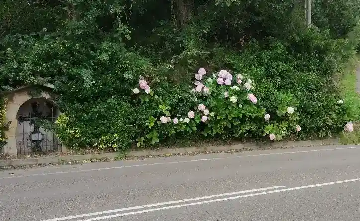 Pequeño humilladero al borde de la carretera con una cruz metálica en su interior. Techado pétreo a dos aguas.