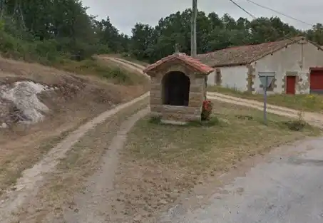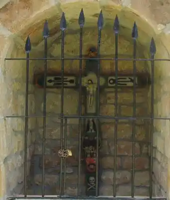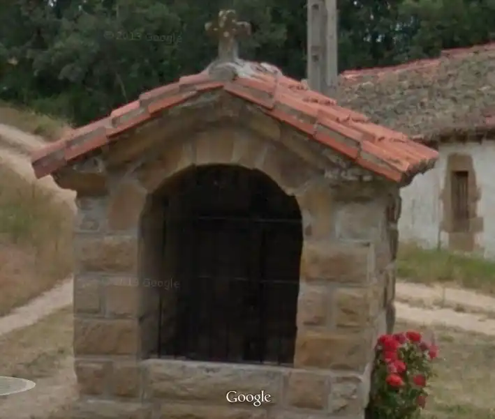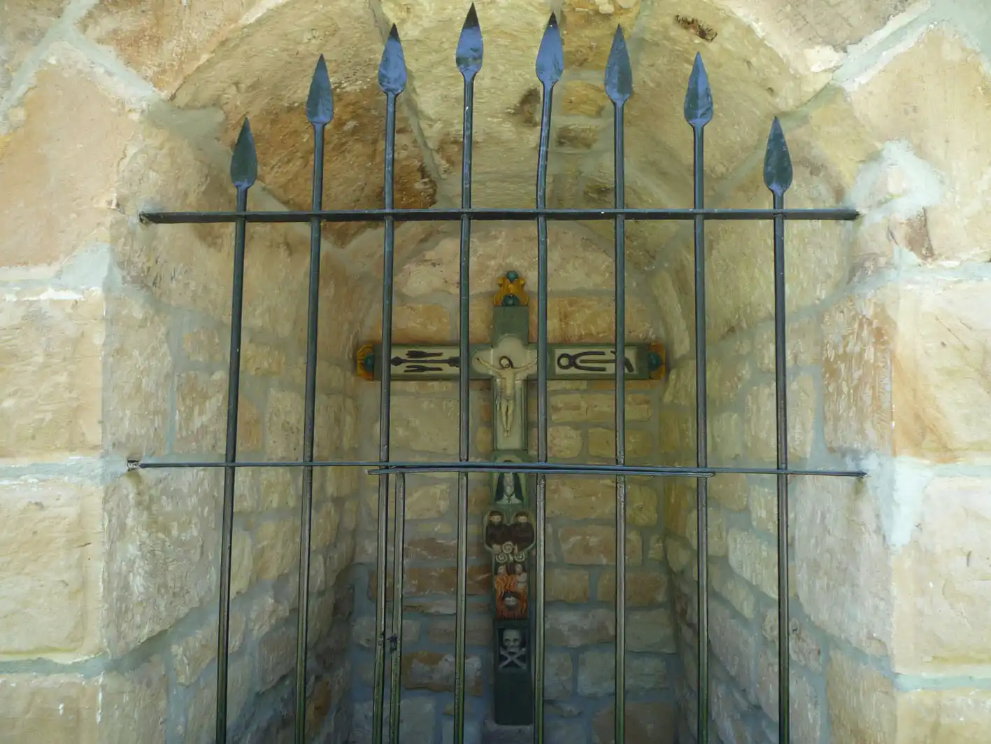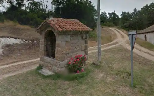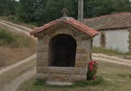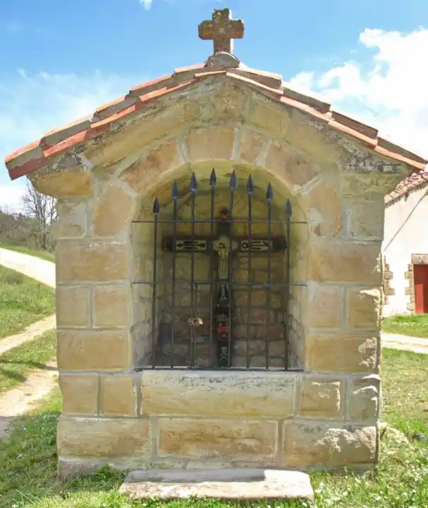 Humilladero con cubierta a dos aguas. Cerrado con reja metálica y con un crucifijo en su interior.