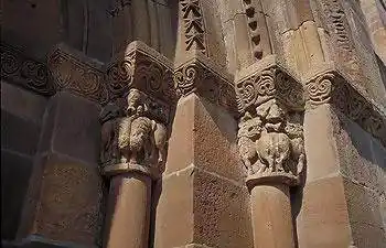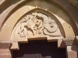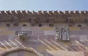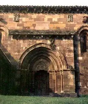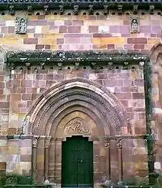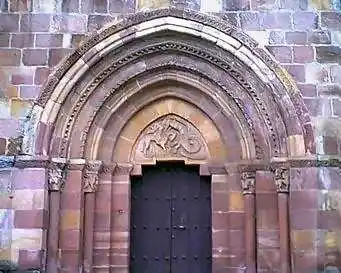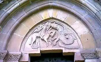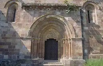 La puerta de acceso al templo se sitúa como es habitual en su fachada sur. Avanzada del muro y protegida por una cornisa con canecillos. Se organiza a partir de un baquetón de cinco arquivoltas apuntadas que apoyan sobre una línea de cimacios decorados con entrelazos vegetales. Llama la atención de la portada sus elementos decorativos, cuya iconografía se basa en la lucha entre el Bien y el Mal. De su portada sobresale el magnífico bajorrelieve del tímpano, en el que se representa a un caballero con su casco, escudo, lanza y espada corta, luchando contra un dragón con cabeza y patas de león, alas de águila y cola de serpiente. Esa misma simbología se representa también por combates de caballeros y animales en sus capiteles, etc. El reverso del tímpano, ya en el interior del templo, el relieve mantiene una parecida representación, pero ahora el jinete hiere a la fiera mortalmente.