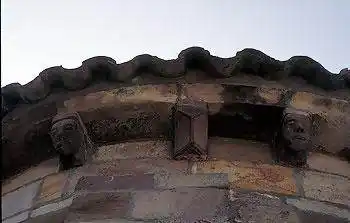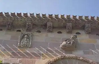Enmarcando la portada aparecen dos ventanas de arco de medio punto doblado y guardapolvos de billetesa la altura de la cornisa de la puerta. Sobre ellos se sitúan dos relieves felinos (una cabeza de león y de una leona con cachorros). Sobre la misma cornisa del resalte de la puerta, se han colocado otros dos relieves, el izquierdo con la leyenda "Santa Marina" y dos figuras femeninas no identificadas de pie bajo arquerías y en el derecho aparece la figura de la Virgen y el Niño. La fachada se remata con una cornisa con rombos tangentes sostenida por canecillos de cierta calidad, entre los que dominan temas de figuras humanas de variada temática, como cazadores, juglares, representaciones obscenas de la lujuria, la avaricia, así como decoraciones vegetales y geométricas.