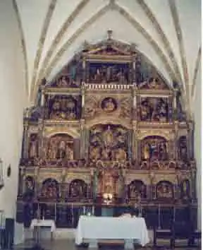 El retablo mayor es uno de los mejores ejemplares renacentistas conservados en Cantabria. Se organiza a base de dos cuerpos, sobre alto banco, y ático, con tres amplias calles que recogen escenas completas y dos entrecalles extremas, en el primer piso, que albergan figuras de bulto. En la ornamentación arquitectónica dominan los arcos rebajados y escarzanos, los tondos y veneras, las columnas abalaustradas y la talla "al romano", elementos característicos de los retablos platerescos. El sotobanco compuesto a base de netos y entrepaños, se ornamenta con motivos de "candelieri". La predela acoge cuatro relieves con escenas del ciclo de la Pasión (Oración del Huerto, Prendimiento, Vía Crucis y Quinta Angustia) y dos figuras de bulto a los extremos (San Miguel Arcángel y San Sebastián). a plomo sobre las columnas y entre una crestería de roleos se representan a los cuatro Evangelistas y a los Padres de la Iglesia occidental (aunque San Gregorio ha sido sustituido por San Antón), mientras que en los netos que sirven de apoyo a las columnas se han tallado pequeños medallones con bustos masculinos. En el centro del banco se incluye un tabernáculo compuesto de banco, con netos y entrepaños, cuerpo con columnas entregas, retalladas y abalaustradas, flanqueando relieves, y remate en cúpula; la puerta del sagrario se ornamenta con una representación de la Última Cena, flanqueándose sendas figuras de la Virgen y San Juan. El tabernáculo se convierte en expositor, al abrirse sus tres paneles centrales, mostrando en su interior columnas abalaustradas y la representación pictórica de siete ángeles portadores de instrumentos de la Pasión, de fuerte cromatismo y potente estilo manierista. En la cornisa, a plomo de las columnas, se incluyen pequeñas figuras de bulto de ángeles portadores de candeleros.