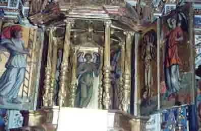 El primer piso incluye los relieves de la Anunciación, la Asunción y el Nacimiento, así como las figuras de Santiago Apóstol y San Bartolomé. El segundo acoge en sus calles laterales los relieves de la Transfiguración y la Adoración de los Reyes, y en la central un tondo representando a la virgen con el Niño lactante. Finalmente, en el ático se muestra la escena del Calvario, con Cristo entre la Virgen y San Juan, y sobre ellos el Padre Eterno. Al los lados aparecen dos tablas pintadas con soldados romanos de tosca factura y sendos medallones relicarios con dos bustos humanos (tal vez representando a un profeta y a una sibila).