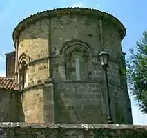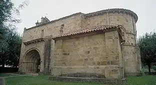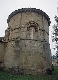 Por el exterior, quizás lo mejor conservado es el ábside, de buenas proporciones y organización primitiva, que está dividido verticalmente por columnas apoyadas en contrafuertes y horizontalmente por dos líneas de impostas, una en la base de las columnas y otra a la altura de los capiteles, adaptándose al arco de la ventana a modo de guardapolvos. Tiene tres ventanas con arquivoltas de baquetones y dos columnillas con capiteles iconográficos. En ellos hay temas como el de los obreros portadores de caldero, que ocupa un capitel de la ventana izquierda, que es repetido en edificios románicos de la prima mitad del siglo XII.La cornisa es simple y está apoyada en canecillos de temática variada sobre todo de tipo animal, algunos de rollos y volutas, y otros iconográficos con arpista, cargador de bidón, hombre y mujer desnudos, etc.. Adosada al ábside se construyó, en época barroca, una sacristía. También son modernas la espadaña, la cubierta y las ventanas de la nave.