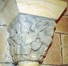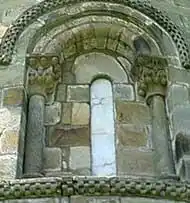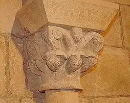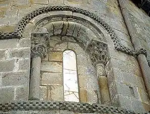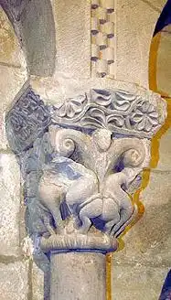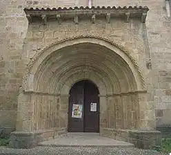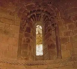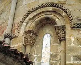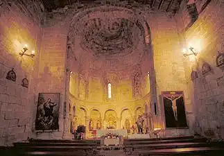 En el interior de la iglesia, el arco triunfal es de medio punto con capiteles figurados y el ábside vuelve a cobrar también el máximo interés esta dividido en tres cuerpos delimitados por impostas con billetes con la misma disposición que en el exterior. En la base del ábside hay una arquería ciega de nueve arcos con guardapolvos de billetes y capiteles decorados de la misma mano de quien talló los exteriores, y otros de piñas, pelícanos, etc. La acción directa del fuego ha provocado la rotura desgraciada de muchos de ellos.
