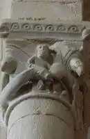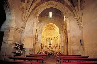 El paso del presbiterio al falso crucero se hace por medio de un gran arco triunfal, doblado y apuntado, sostenido por columnas entregas que acaban en capiteles con la siguiente figuración: lucha entre humanos y seres fantásticos y monstruos que enredan sus cuellos. En este ya primer tramo de la nave es donde se ubican, a cada lado, las absidiolas, o capillas absidiales, cubiertas con bóveda de horno y precedidos de arco triunfal apuntado y doblado que carga sobre capiteles decorados.