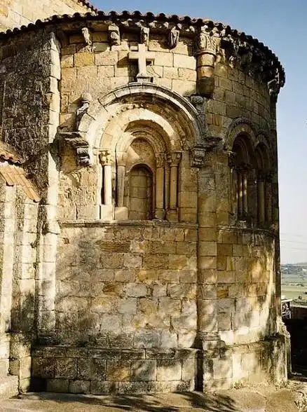 El ábside: De factura plenamente románica se divide por una imposta de doble caveto en dos cuerpos horizontales y en tres calles verticales, divididos por columnas e impostas que rematan con capiteles figurados (cabezas cortadas) sobre los que se apoya la cornisa decorada con dos bolas de caperuza sobre imposta ajedrezada en línea con quince canecillos que la sustentan (cinco por calle y casi perdidos los de la parte sur). La serie de canecillos de Santa María es muy variada con motivos vegetales, geométricos, animales y humanos en distintas actitudes, destacando aquellos de carácter sexual.