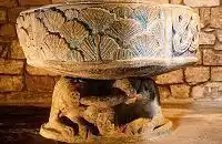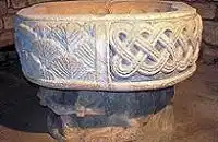 Destacable es también, la original pila bautismal que puede catalogarse como la más bella, junto a la de Santillana, de todo el románico cántabro. Su factura al igual que la del resto de la iglesia puede situarse a finales del siglo XII o inicios del XIII. Se halla colocada en la pequeña habitación que forma el piso bajo de la moderna torre. Es la pila más bella de todo el románico montañés, sólo equiparable con la de Santoña y Santillana.