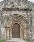 Comenzando por la portalada principal, hemos de decir que está orientada al oeste, en un muro adelantado de la fachada general, cubierto con tejadillo que se avanza sobre una cornisa sin otro ornato que ocho canecillos en caveto. La arcada de entrada, ligeramente apuntada y abocinada, lleva un guardapolvos desnudo y cinco arquivoltas prismáticas apoyadas en seis columnas rematadas por originales capiteles de decoración geométrica e iconográfica, llenos de ingenuidad formal y arcaica naturalidad. Sobre cimacios en caveto apoyan las cuatro arquivoltas simples y el guardapolvos.