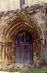 La portada de la fachada sur presenta tres arquivoltas donde predomina la decoración vegetal. Sobre esta puerta existe una galería de 14 arcos de medio punto que descansan sobre columnas primáticas lisas. A ella se accede por el husillo situado a derecha de la portada. A su lado, adosada, encontramos la sacristía.