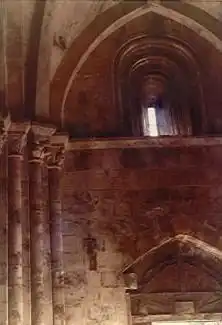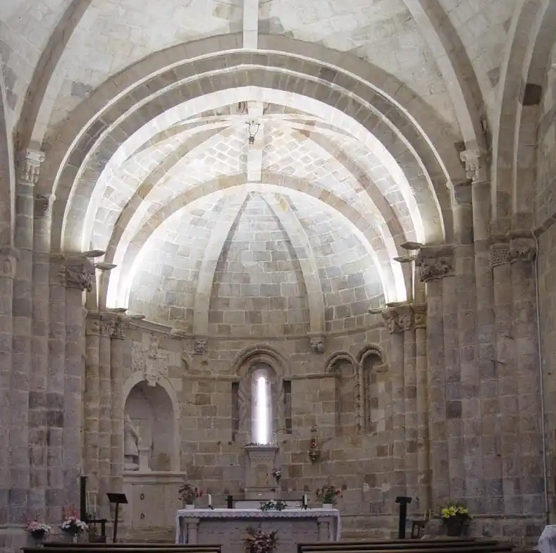 Compuesto por una nave única dividida en tres tramos separados por arcos fajones de medio punto, con bóveda de crucería de carácter decorativo. A ellos sigue un tramo recto que precede al ábside semicircular. Cada tramo está dividido mediante arcos fajones doblados que descargan sobre fuertes pilares compuestos.