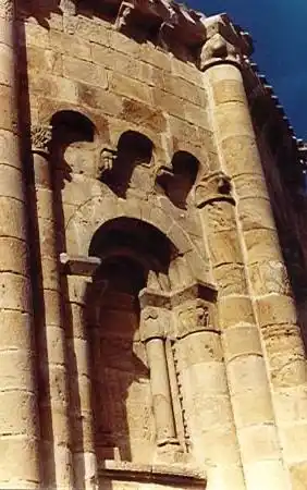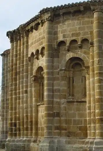 Lo que inicialmente impresiona de esta edificación es el ábside, uno de los más bellos y monumentales del románico. De estructura semicircular clásica, de bellas proporciones, sillería perfecta y precedido por un tramo recto, se divide en siete paños mediante haces de columnas con un rico juego de distintas alturas. Al atractivo conjunto de líneas verticales se contraponen las horizontales formadas por la de arquitos, impostas, y la cenefa de la base de los ventanales. Cada paño presenta decoración en los capiteles de las columnas y los canecillos del tejado y de las arquerías ciegas de influencia lombarda. Se representan temas vegetales y animales si bien también aparecen rostros y figuras humanas.