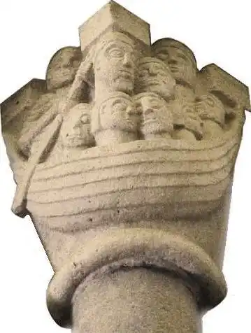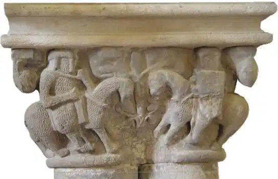 La decoración del interior se concentra en los capiteles de las columnas. El capitel más interesante del muro sur representa a San Martín repartiendo su capa con un pobre. El muro norte muestra dos escenas relacionadas entre sí. La primera representa a varios hombres en una barca y podría simbolizar a Jesús con los apóstoles o el traslado del cuerpo del apóstol Santiago a España. La segunda representa un ataúd entreabierto y varios personajes que lo rodean y podría representar la resurrección de Cristo o el hallazago y custodia del cuerpo del apóstol Santiago.