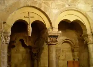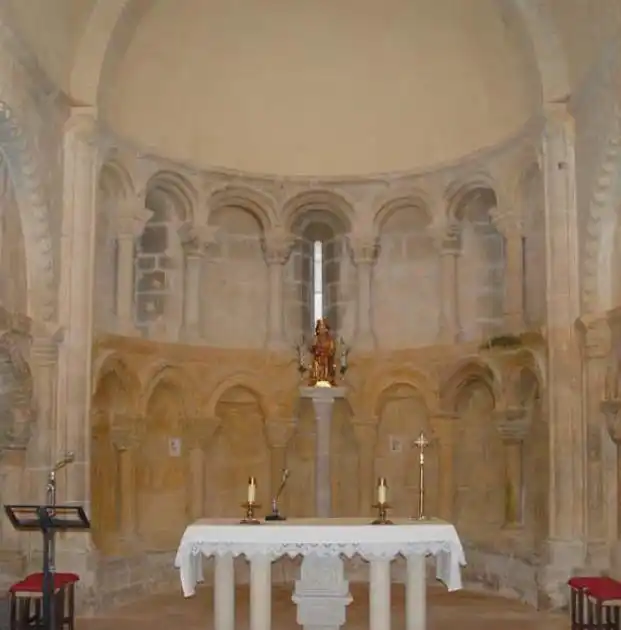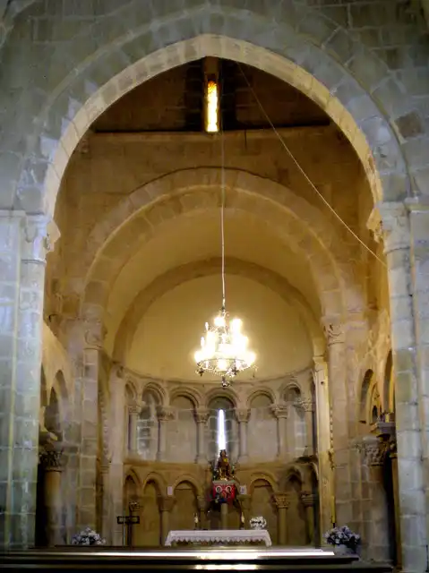Ya en el interior, de gran riqueza, la nave se aboveda con bóveda de cañón, el crucero con una bóveda de crucería de gruesos nervios y el ábside con bóveda de horno. El presbiterio congrega el mayor interés y vistosidad. Tiene una bellísima arquería doble de siete arcos ciegos cada una, que recorre el hemiciclo. Existe una nutrida serie de capiteles decorados con escultura fuerte y sin demasiado refinamiento. Se podría destacar la escena de "David y Goliat", así como la del "Paraíso Terrenal" con Adán, Eva, el árbol surtido de fruta y la serpiente, etc.