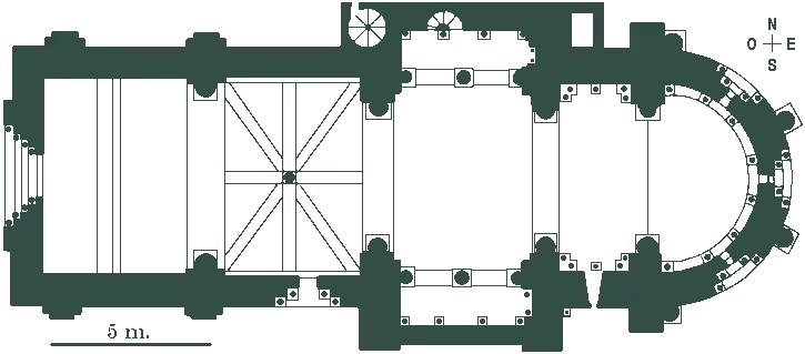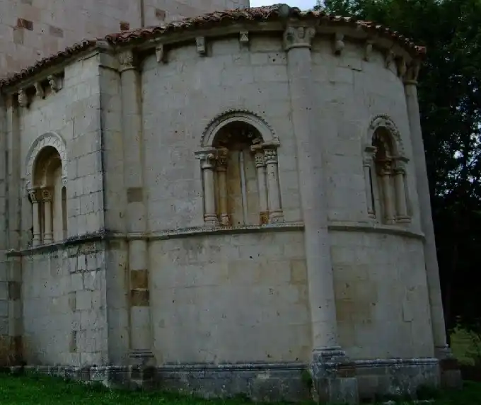 Ábside de tres partes separadas por medias columnas con capiteles y basas decoradas. La línea de impostas no ofrece una decoración similar en todos los tramos (palmetas, perlas, sogueados y flores inscritas en círculos). Sobre la línea de impostas se las ventanas del ábside, con columnas y arquivoltas. El acceso al templo se realiza a través de dos portadas situadas en las fachadas sur y oeste. La concepción y ornamentación de estas dos entradas es de carácter cisterciense, ostensible en el predominio de las líneas arquitectónicas por encima de la decoración, que es muy austera, esqumática y de carácter vegetal.