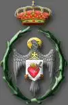 Águila de San Juan sujetando un escudete sobre su pecho en el que, sobre campo blanco, aparece el Corazón de la Virgen atravesado por la espada; a ambos lados las palmas del martirio y encima la corona real.